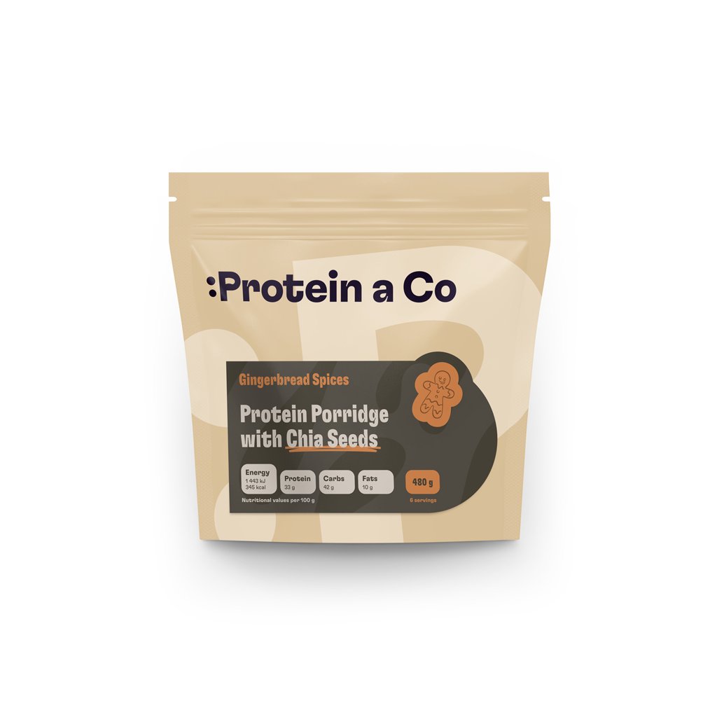 Gingerbread spices: ovsené vločky (min. 40 %), 80 % srvátkový koncentrát (min. 28 %), chia semienka (min. 5 %), BIO kokosový cukor, sušené mlieko, perníkové korenie (škorica, klinček, koriander, fenikel, aníz, nové korenie, muškátový kvet, muškátový oriešok, badián – v rôznom pomere)